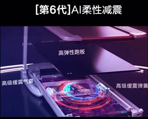 截至目前亿健共研发出橡胶减震、固定气量的气囊减震、蜂窝减震、专利多级减震、AI智能减震和AI数字化柔性减震六代减震控制技术,其中第六代AI数字化柔性减震控制技术被广泛的运用在亿健的跑步机产品中。AI数字化柔性减震控制技术是利用高弹性跑板、高级缓震气囊、高级缓震弹簧和精钢底座一起作用,让使用者在跑步时感受塑胶跑道的质感,保护膝盖和脚踝不受损伤。这套系统除了着出色的降噪属性,运动时静音效果好,不会负面影响到周围的人和楼上楼下的邻居。