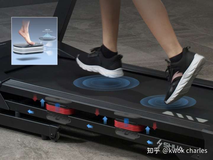重点当然要讲讲它的缓震系统,五层五组减震组合:跑步带减震+跑板减震+气囊减震+悬挂避震+章鱼仿生吸盘,最大程度的防护膝盖,减少噪音,把冲击力消减在地板之上。