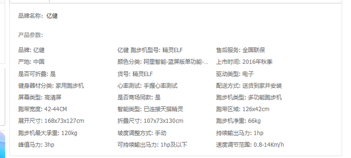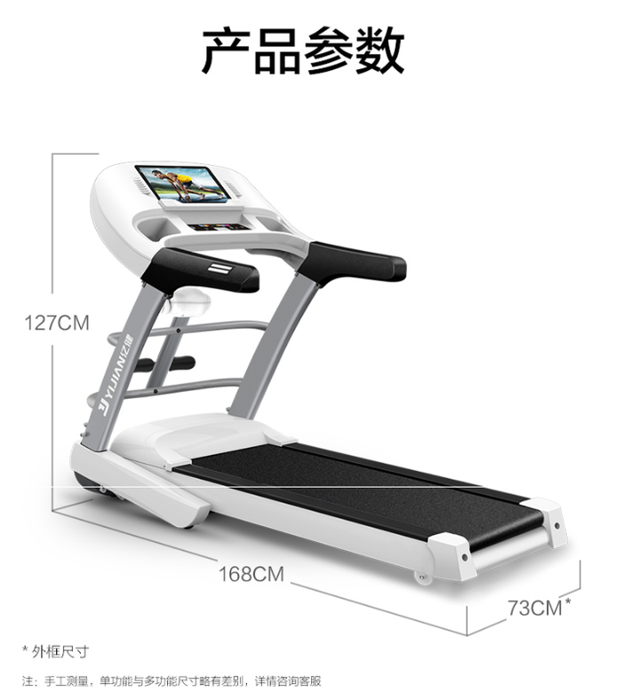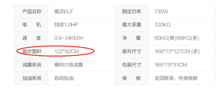 跑带体积看完,就要去看整体机器的体积,这关系着摆放。以恶魔ELF为例,虽然跑带面积只要122*42,但是整机占地面积却是168*73,几乎是一张茶几的摆放面积,假如再大一些,甚至有可能是一张沙发一张床的面积,这个时候,假如家居空间并不是十分宽裕,那就需要仔细规划室内摆设,不然很可能造成买回去,难以摆放的情况。