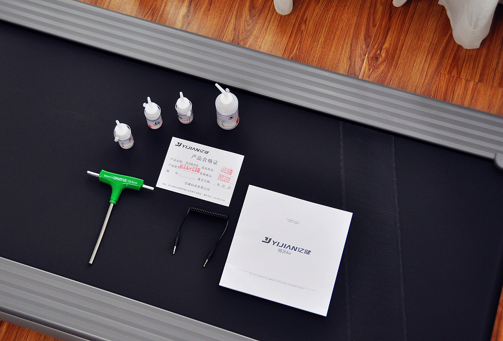 随机附带的配件袋里,包含产品说明书/保修卡/合格证1套、T型扳手、电源线、润滑油和安全锁的锁夹。按摩椅油的作用主要是让跑板和跑带之间有一个润滑效果,并在瓶子上给我们做了详细标明!此外,其他配件也颇有用处,后面会详细介绍。