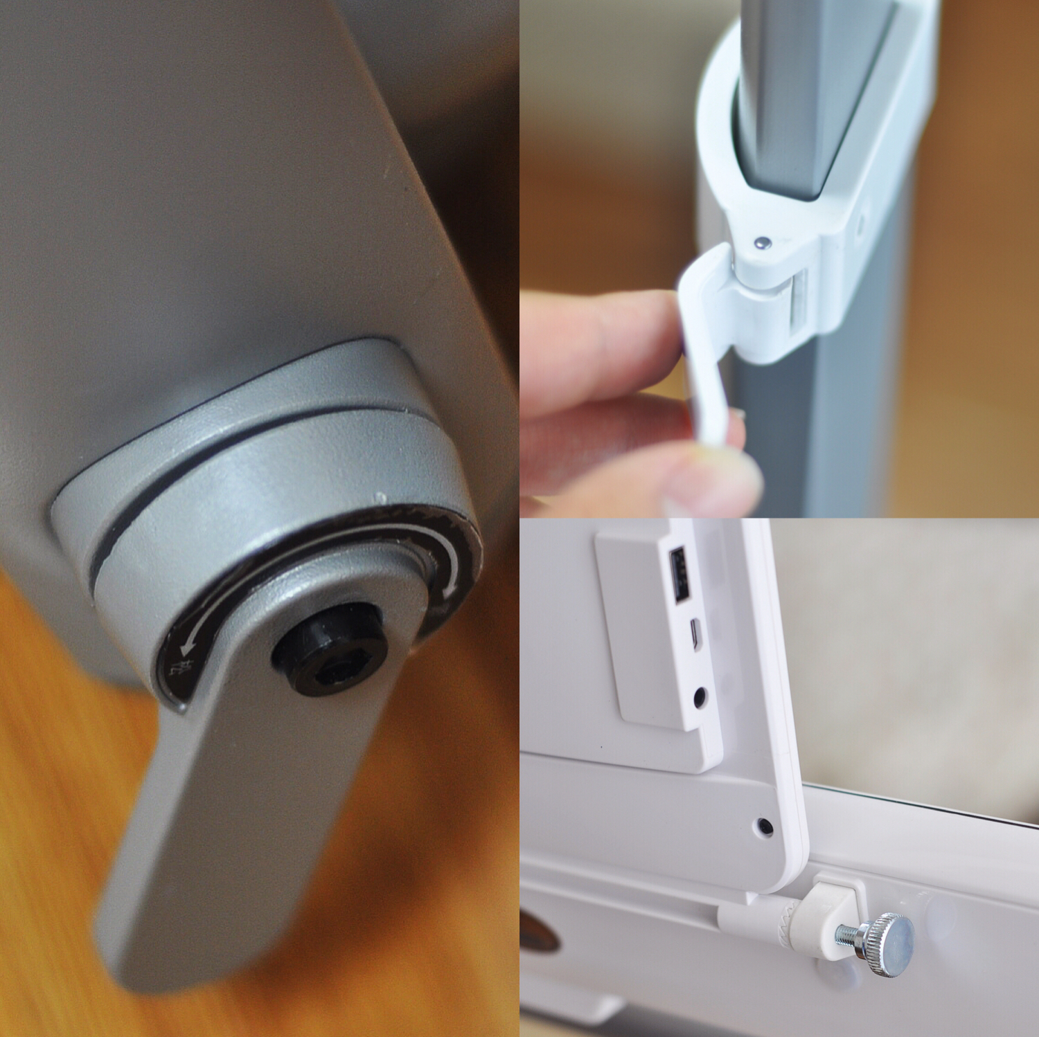 其他细节也不容忽视,固定立柱的扳手在使用时非常顺畅,细节设计也很到位。彩色萤幕的设计同样精巧,通过齿轮锁紧,可以调账不同位置和俯仰角度。
