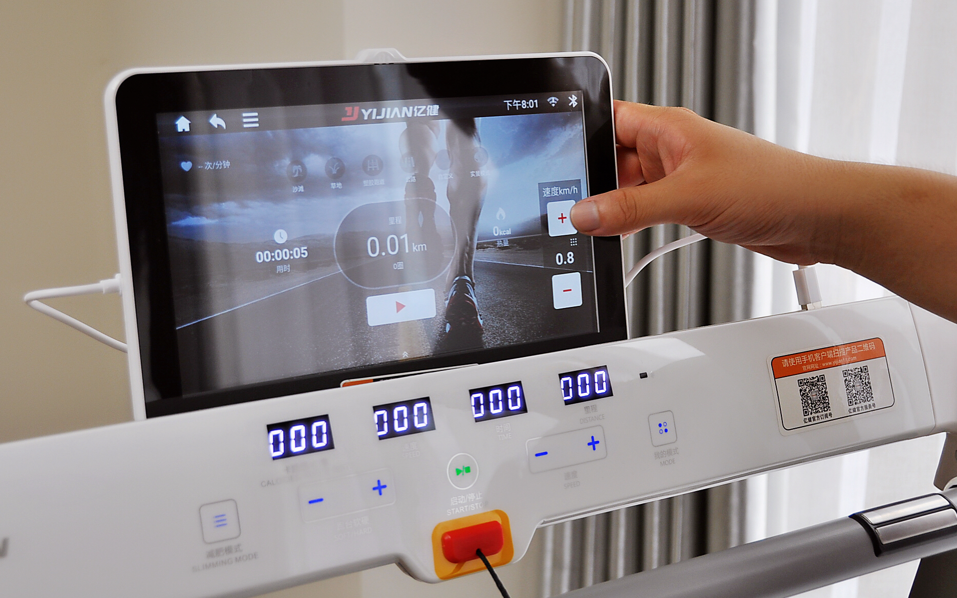 按摩椅的触控面板,4个显示窗口分别展示跑动时的卡路里、速度、天数和距离。按键不多但都很实用,可以控制启动或停止、调节速度和跑台软硬度,或者切换慢跑模式。