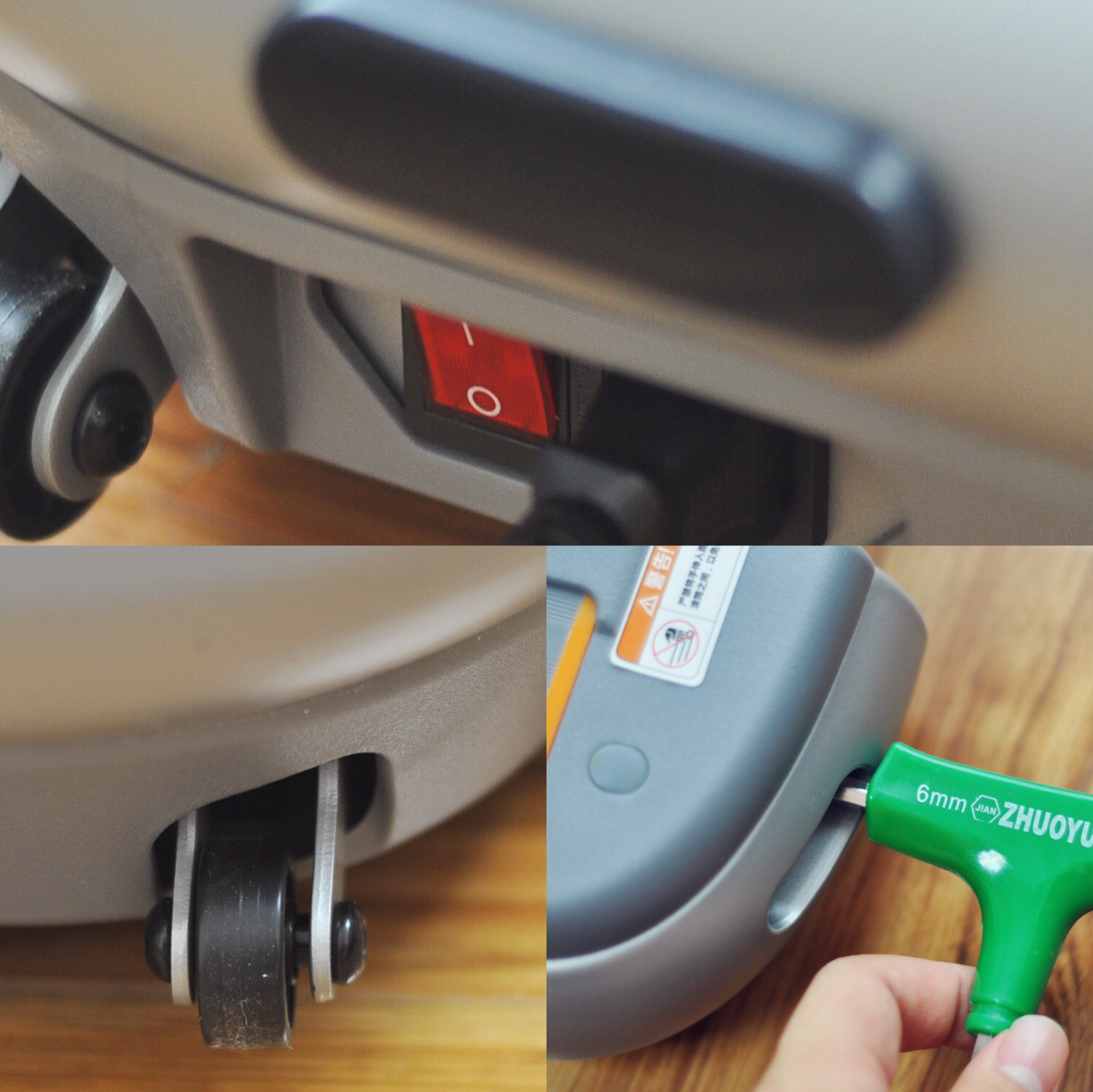 底部前侧除了有电源接口和开关,还有配置两个滚轮,方便移动按摩椅。前侧的两个防撞条也能避免在移动时撞击到硬物损伤按摩椅外观。底座前侧还有位润滑油添加口,便于定期补充润滑油。
