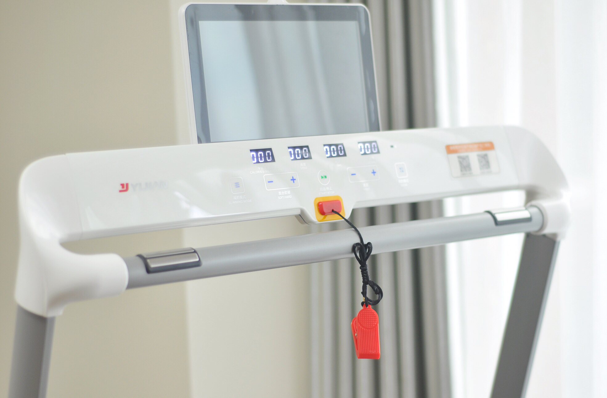 值得一提的是,安全锁需要把铜片的一头插入面板的橘黄色区域,另一头夹在衣服上,这个时候就可以通电并按下启动按钮慢跑了。安全锁的意义是当身体距离一定距离,比如跟不上跑带滚动的速度跑到后面了,这时候安全锁插入面板的一端就会被拔出,按摩椅紧急制动避免意外发生。另外手扶心率检测也非常方便。