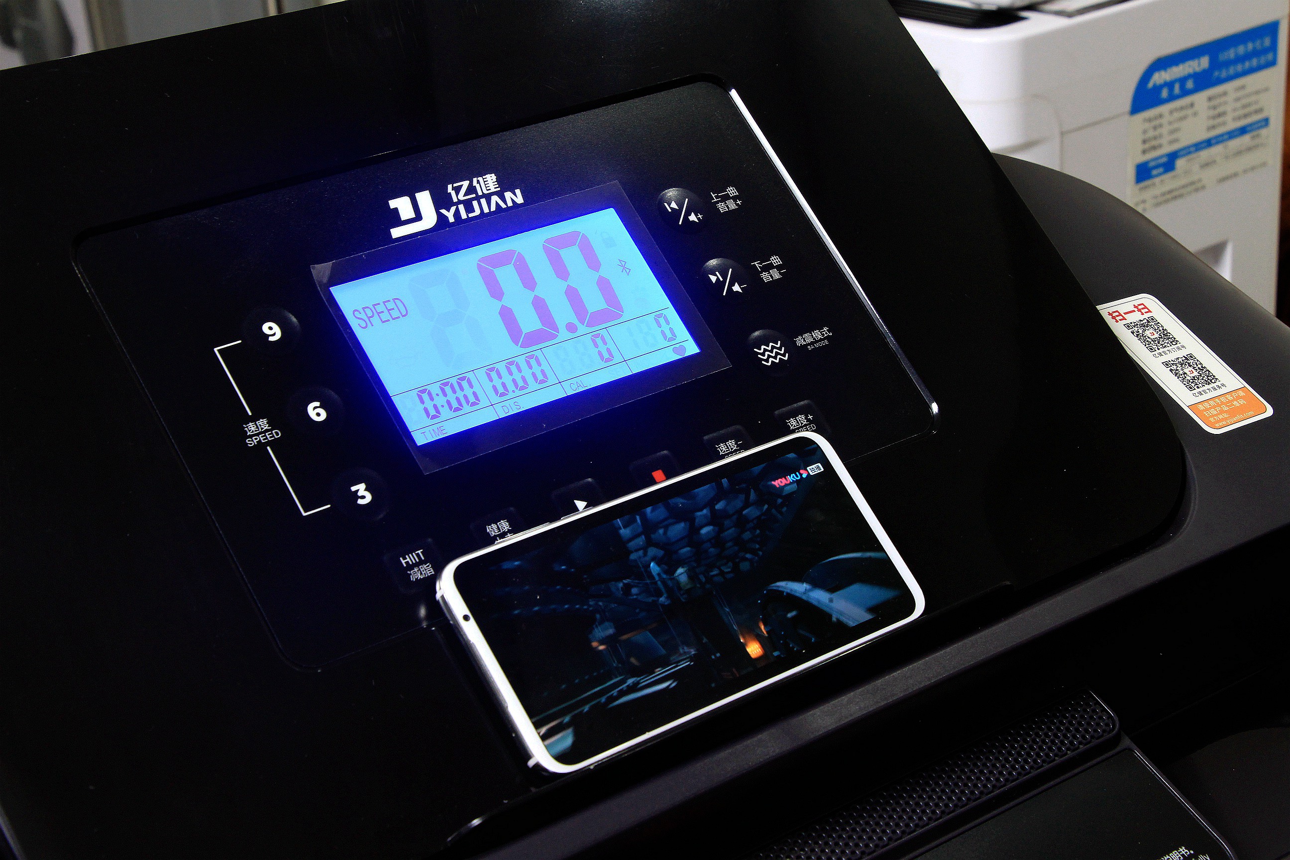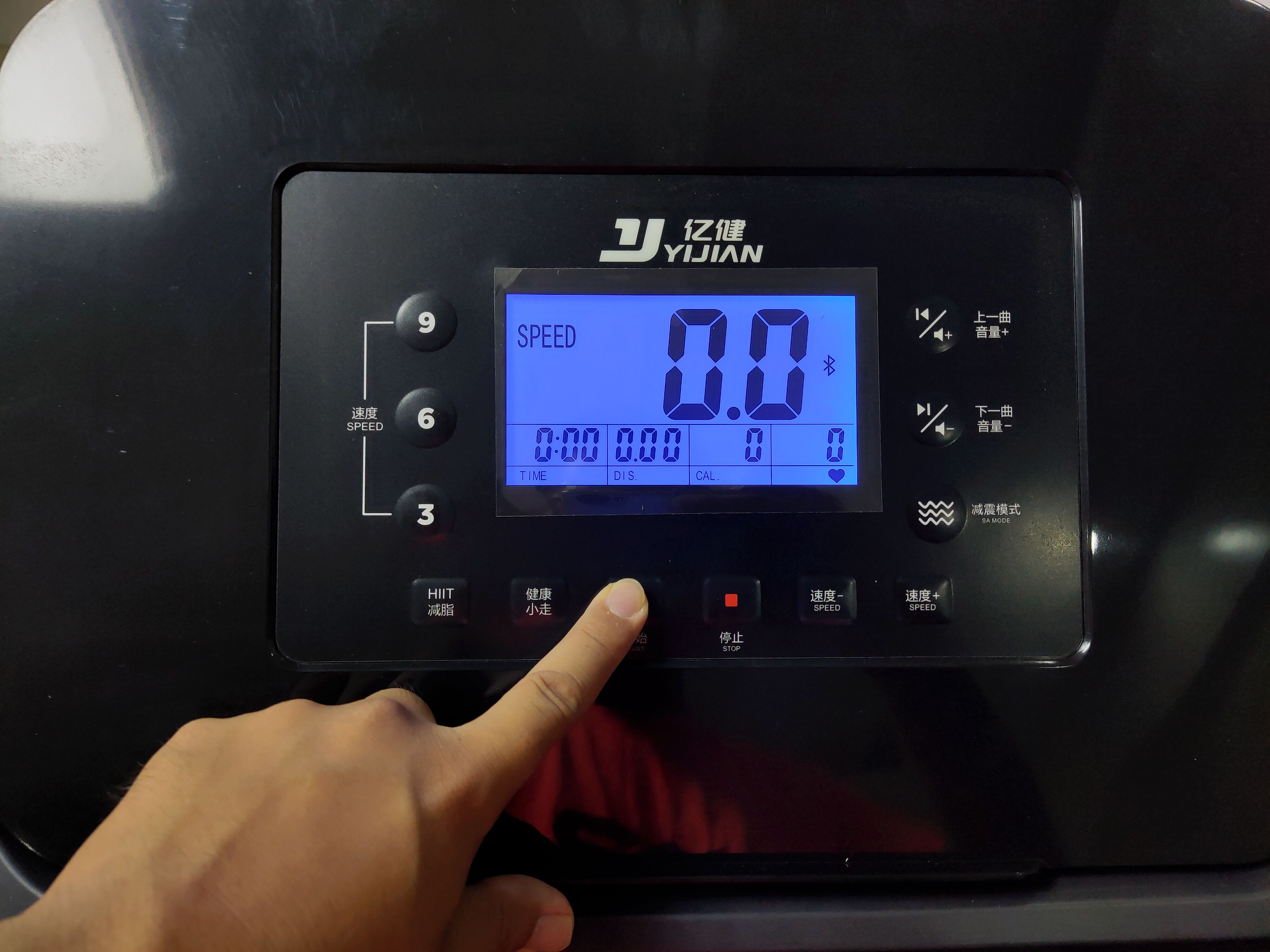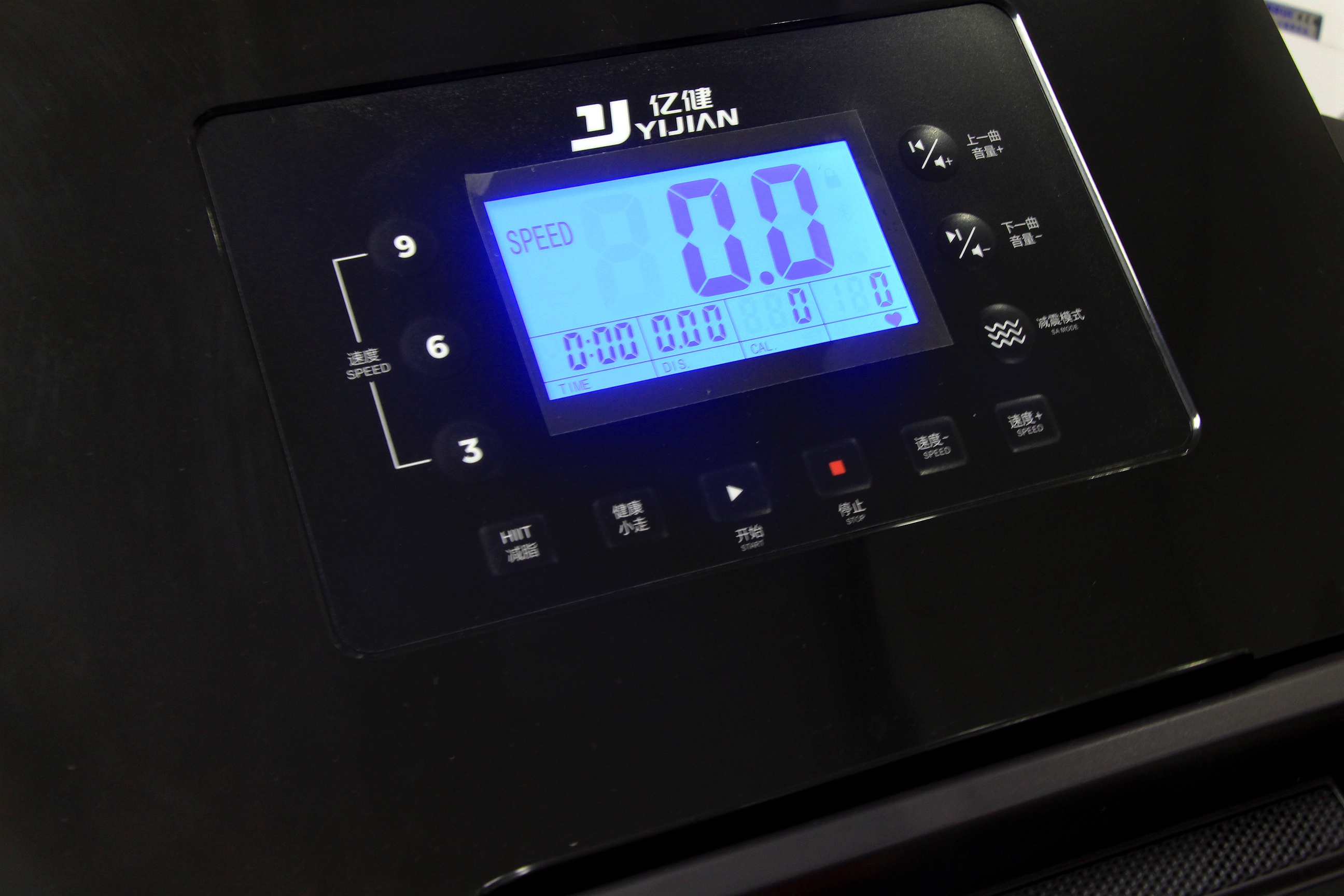 屏幕的底色为蓝色,屏幕上还有亿健的LOGO设计,左边为速率调节,3,6,9三个常用速率,右侧为音量按键,上下曲和减震模式调节。下半部分为减脂跑,健康小走,开始,停止,速率-,速率+按键。显示屏上主要显示按摩椅的速率,时间,距离,卡路里和心率数据。对日常体育运动和速率跑的话却是非常方便的。