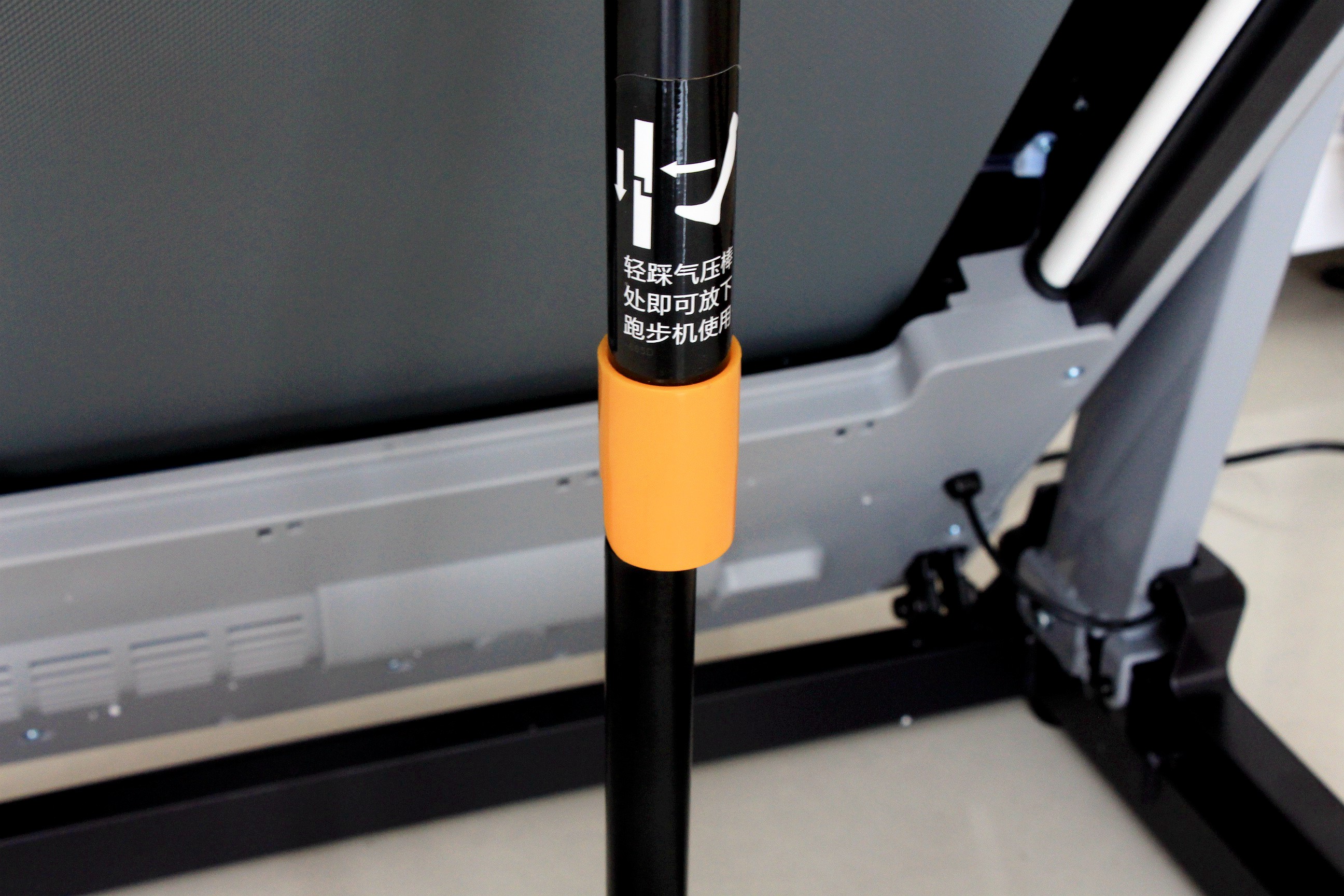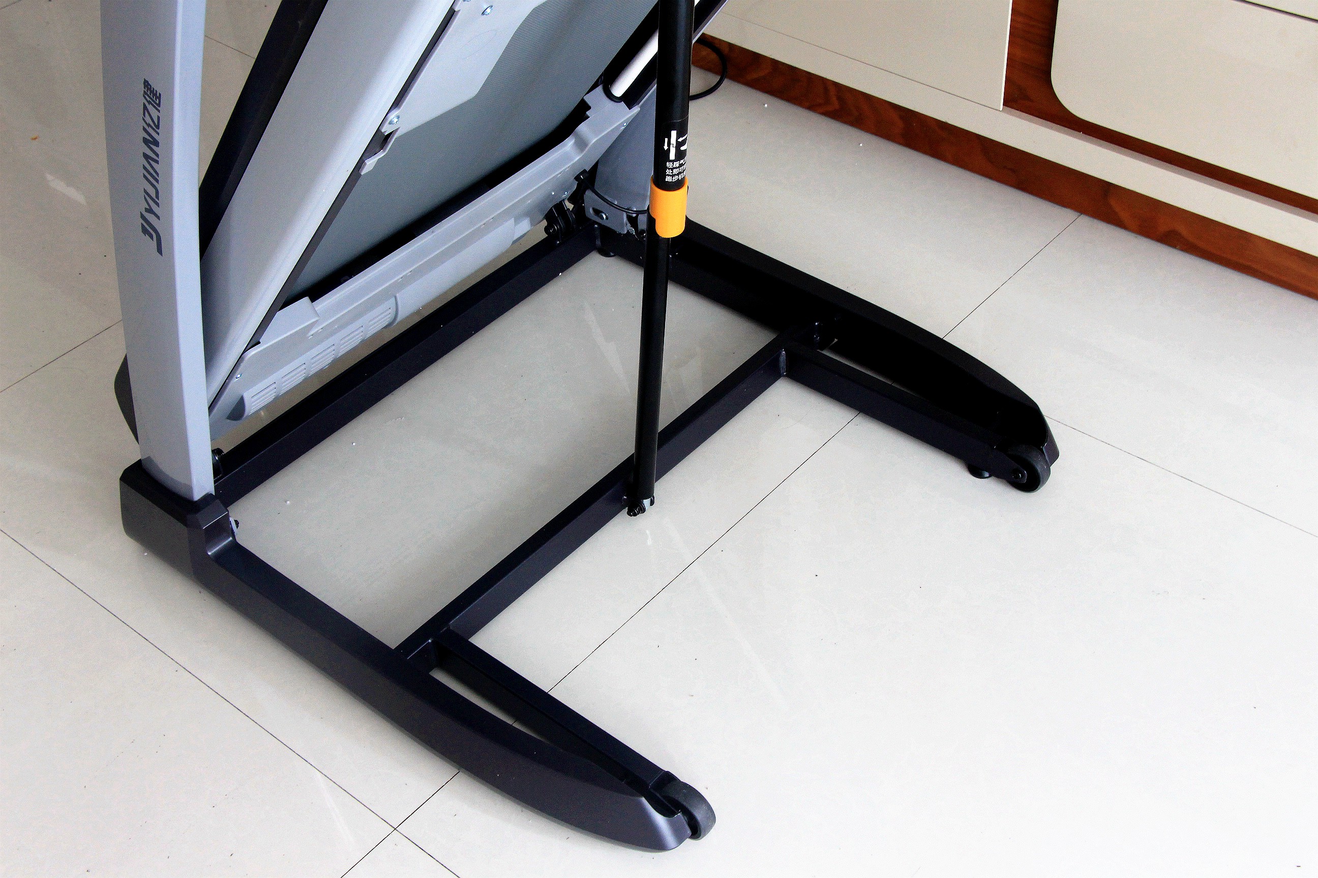 按摩椅的支撑气压杆很牢固的,扶起后不会轻易落下。当我们用脚踩一下黄色部分,跑台才会慢慢落下,落下的过程大概20多秒左右,所以也不用很紧张会砸到脚。从底部还能够看出按摩椅的架构却是比较稳妥的。
