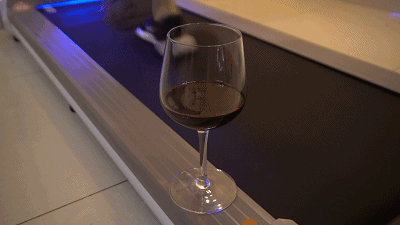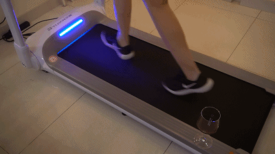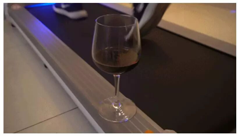 通过上述GIF动图可以发现,科技犬在跑台顶端面板区域放置一支红酒,从上图中可清晰的发现,在6速的速度模式下,杯内的红酒几乎没有出现晃动,非常稳定的置于杯中,跑台稳如泰山。