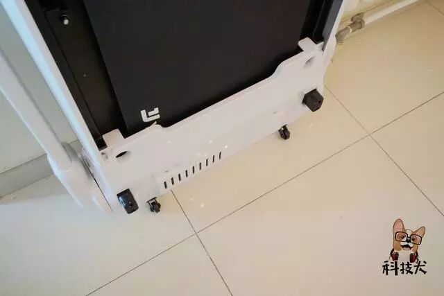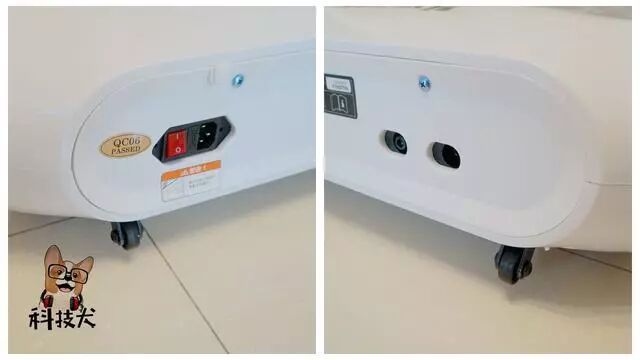 为了便于收纳和移动,亿健恶魔Note智能化按摩椅底部面板端顶部提供了两只滑轮组,便于使用者挪动走步机,左侧滑轮一侧提供了半隐藏式电源插口,插口左侧采用了撞色设计的电源开关键,显眼的配色便于使用者快速识别,开关按键阻尼适中,开关动作伴随着噔、嘀声一气呵成,即便盲操作通过清脆的声音也能判断出目前按摩椅是迈入还是关闭状况。