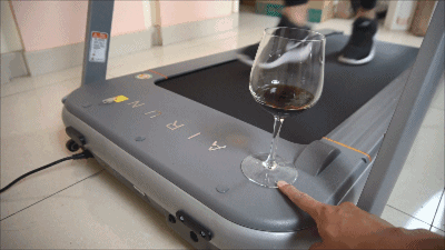 通过上述GIF动图可以发现,信息技术犬在跑台顶端面板区域放置一支红酒,从上图中可清晰的发现,在6速的速度模式下,杯内的红酒几乎没有出现晃动,十分稳定的置于杯中,跑台稳如泰山。