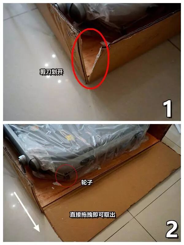 取出系绳推出亿健恶魔Air按摩椅,这里信息技术犬给大家分享一个小技巧,将顶部包装盒袋一侧两边用剪刀划开,漏出亿健恶魔Air按摩椅顶部滚轮,划开后的纸板与地面平行,然后到亿健恶魔Air按摩椅的另一侧,轻抬机身,此时顶端滑轮方可接触地面,稍加用力轻推或者拖拽方可将亿健恶魔Air按摩椅取出,一个人随心所欲搞定,不需要借助任何工具,同时包装盒袋还能完美的保留,便于日后的维护和收纳。