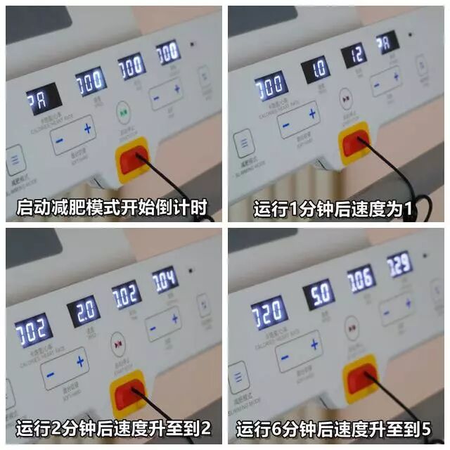 启动后可根据用户的需要,使用速度+、速度-键来调整速度。同时可以自由调整跑台的软硬程度,该功能总共有F01到F24共计24种。 操作形式按下跑台软硬+-来实现。