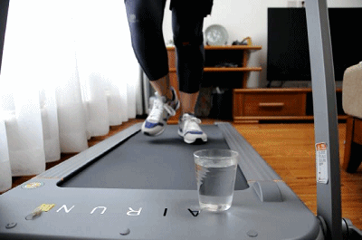 为此我也进行了一组比较有趣的测试,看看我们放置一杯较满的水杯在跑步机上,同时进行体育运动后,即便非常剧烈的奔跑,也不会将水溢出。亿健的这款小型跑步机并没有因为追求轻薄而忽略减震,居然也有配备9mm的专业缓冲减震带,可以识别体重,做到智能减震,其他平板跑步机连减震都不一定有呢。
