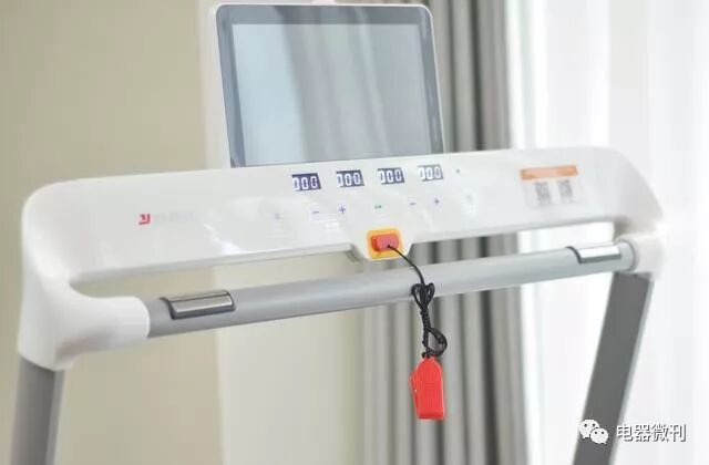 值得一提的是,安全锁需要把铜片的一头插入面板的橘黄色区域,另一头夹在衣服上,这个时候就可以通电并按下启动按钮跑步了。安全锁的意义是当身体距离一定距离,比如跟不上跑带滚动的速度跑到后面了,这时候安全锁插入面板的一端就会被拔出,跑步机紧急制动避免意外发生。另外手扶心率检测也非常方便。
