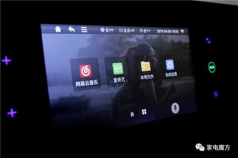 屏幕底部分别是主页键、多媒体键和语音交互键。值得一提的是多媒体键,包含网易云音乐、爱奇艺和自主播放内容,让跑步不再枯燥。