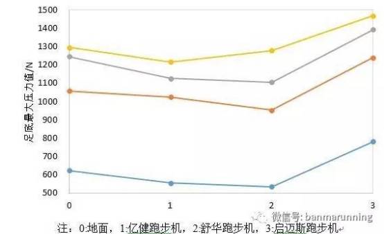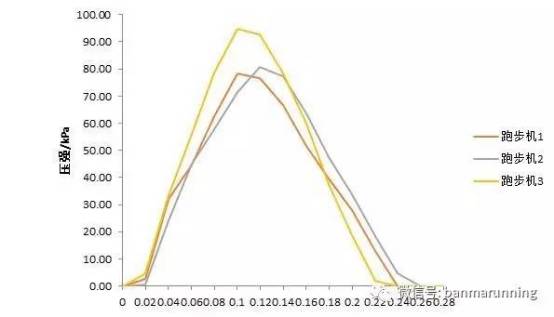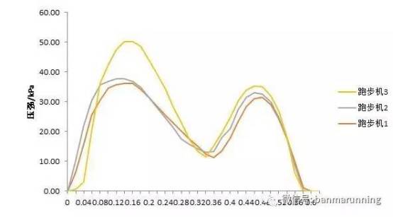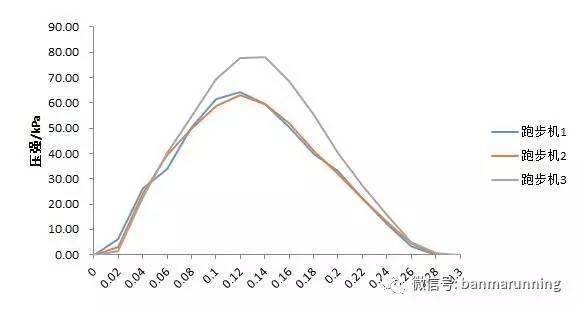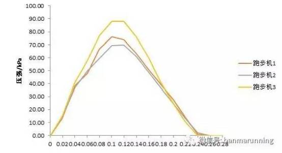 从中速跑(9km/h)足底压强测量结果看,舒华的气动效用与亿健相当,启迈斯的气动效用最差。