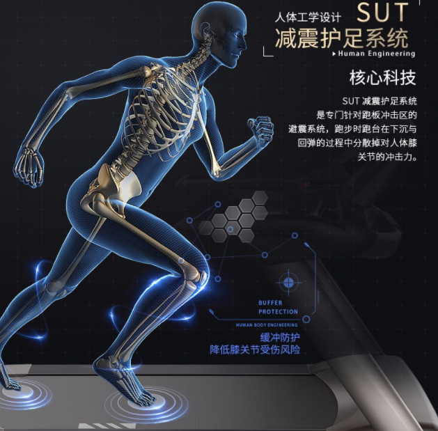 SUT减震护足系统:舒华慢跑机的高端产品采用SUT减震护足系统,是一种针对跑板冲击而设计的避震系统,符合人体工学设计,能有效分散跑台回弹的冲击力。