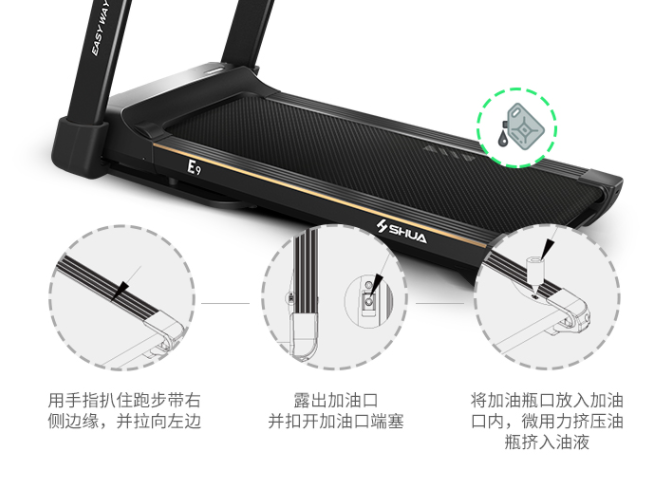舒华慢跑机采用便捷加油设计,只须要简单的三步,就能轻松为慢跑机加油,延长跑带的采用寿命。