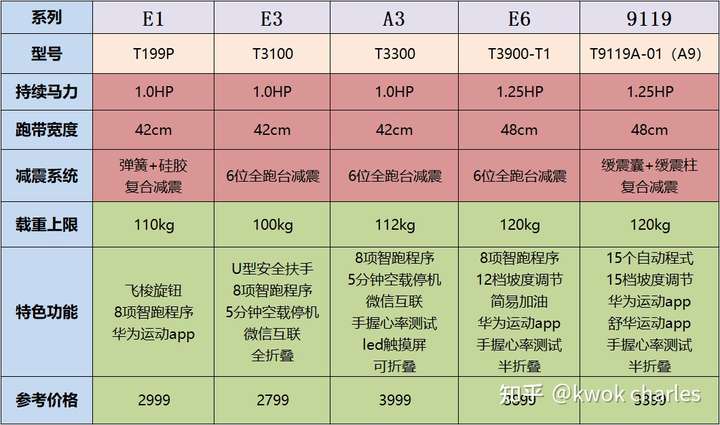 点评:①其实有很多人拿E6和9119系列对照,E6可以说是9119系列的升级版,两款性能方面其实没太大区别,跑带宽度都是45cm、承重上限都是120kg,持续马力都是1.25HP都支持折叠收纳。