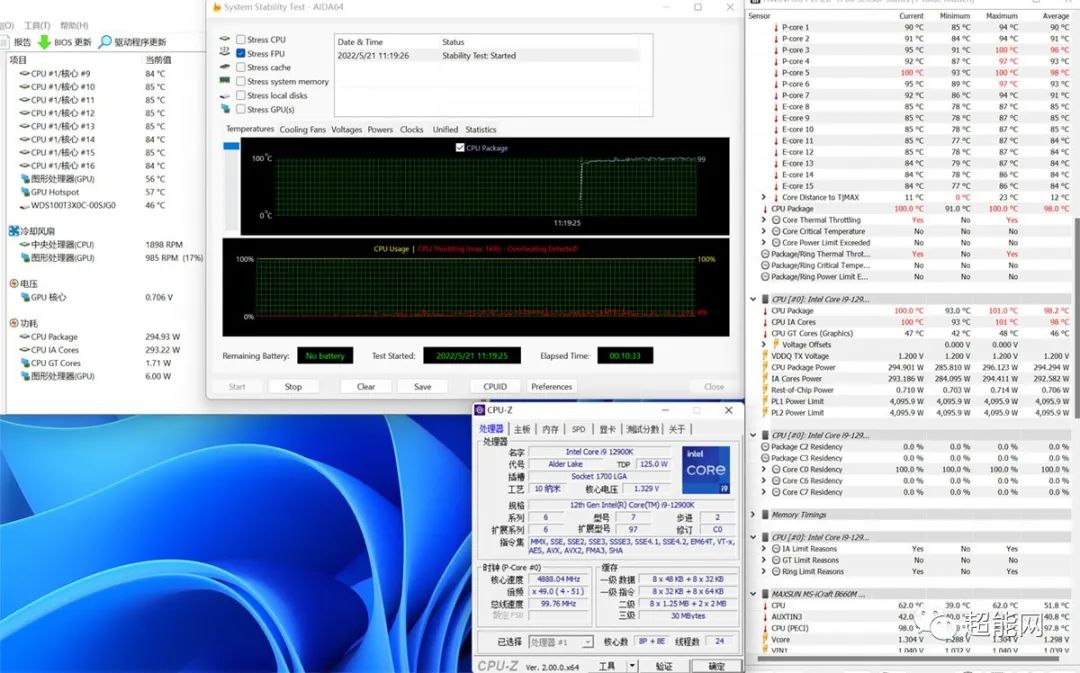 经过我们测试铭瑄MS-iCraft B660M WIFI是可以保障Core i9-12900K稳定工作的,稳定的通过了AIDA 64 FPU烤机10分钟烤机测试,由于功耗全解CPU的Package功率达到了295W,SSD用了16相的CPU供电系统设计所以配12代酷睿i9这档次的CPU都没难题,当然了过热这个就没办法了。