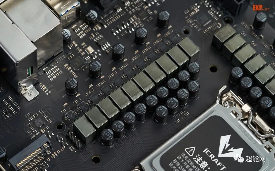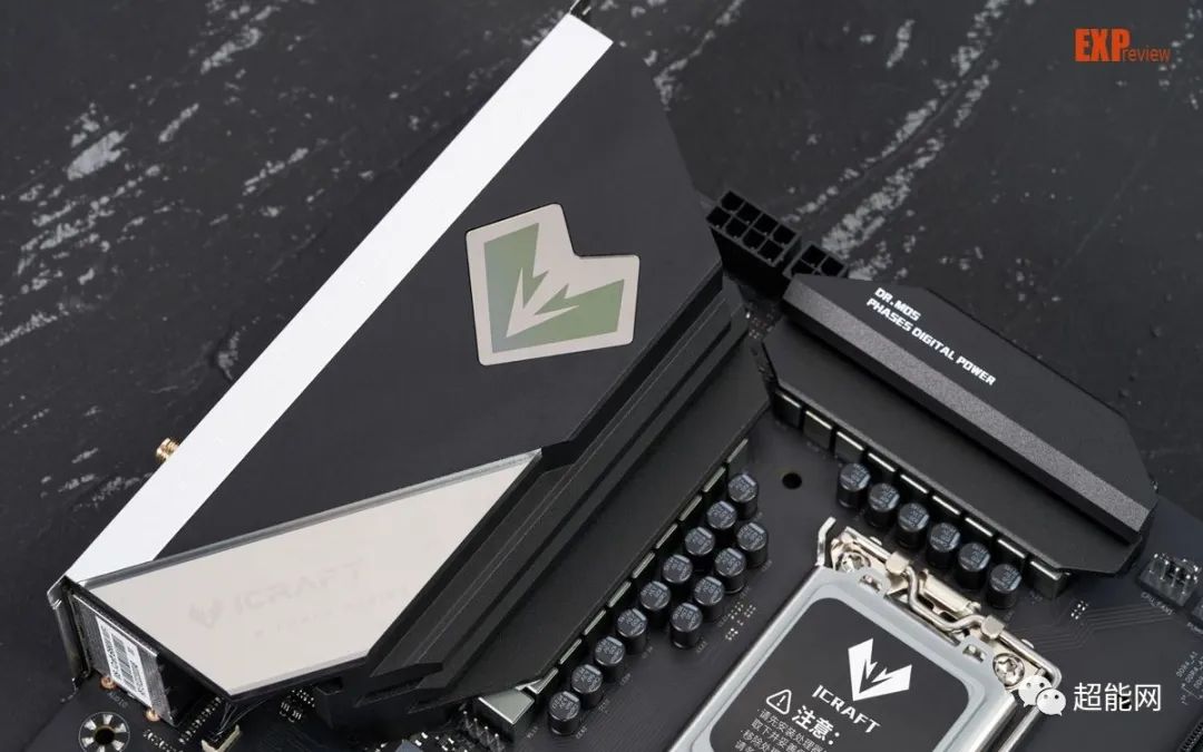 尽管说B660SSD不全力支持CPU省电,但这些SSD只不过还是可以把CPU的功耗限制解除的,性能全开的Core i9-12900K功耗还是很可怕的,所以 铭瑄MS-iCraft B660M WIFI配备了多达16+1+2相供电系统,其中16相是CPU核心供电系统,1相核显供电系统,2相AUX辅助供电系统,每相供电系统都配备全封闭式电感与CapXon固态电容,采用8+4pin的CPU供电系统接口。