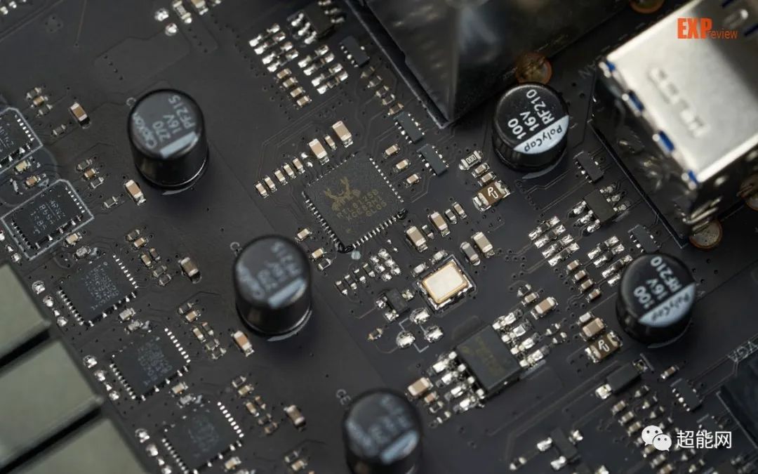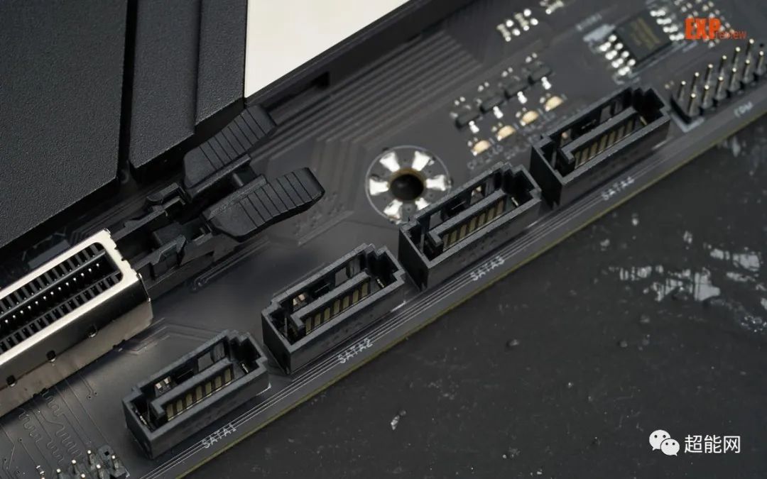 板载M.2接口有三个,都是PCI-E 4.0 x4的,均不全力支持SATA,一个靠近CPU的M.2 2280是由CPU提供的,这接口没有配M.2散热片,但由于是CPU提供的接口有着更低的延迟所以又是首选的接口,所以主盘建议买那些带散热片的高性能SSD,另一个由PCH提供的M.2 22110口则有几块较大的散热片覆盖。