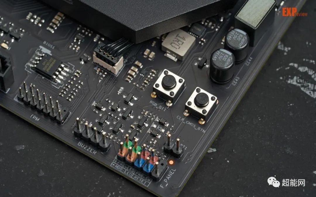 SSD上有三个按键,粗看还以为在是常见的电源开关和重启键,但认真看了下并并非,右侧那个是清空CMOS键,内存省电设置失败后很有用,左侧的那个是SSD灯光效果控制键,可控制板载的灯和RGB灯带口的灯光效果。