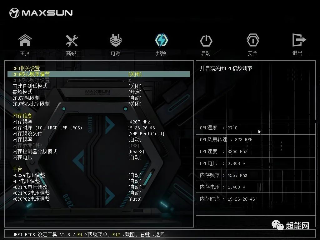 SSD上高频内存也是没难题的,我们这套DDR4-4266内存间接开XMP就能点亮进入系统,当然12代酷睿非K处理器对DDR4-4000以上的省电是有一定限制的,大家使用时请注意,我们测试用的是带K的CPU才没难题。