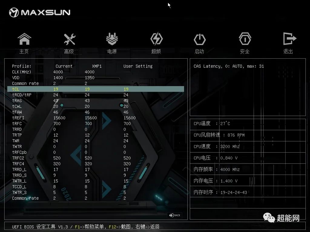此外在XMP模式下内存时序的子菜单是不会出现的,得改成手动模式才能看到上面这个内存时序的调节菜单。