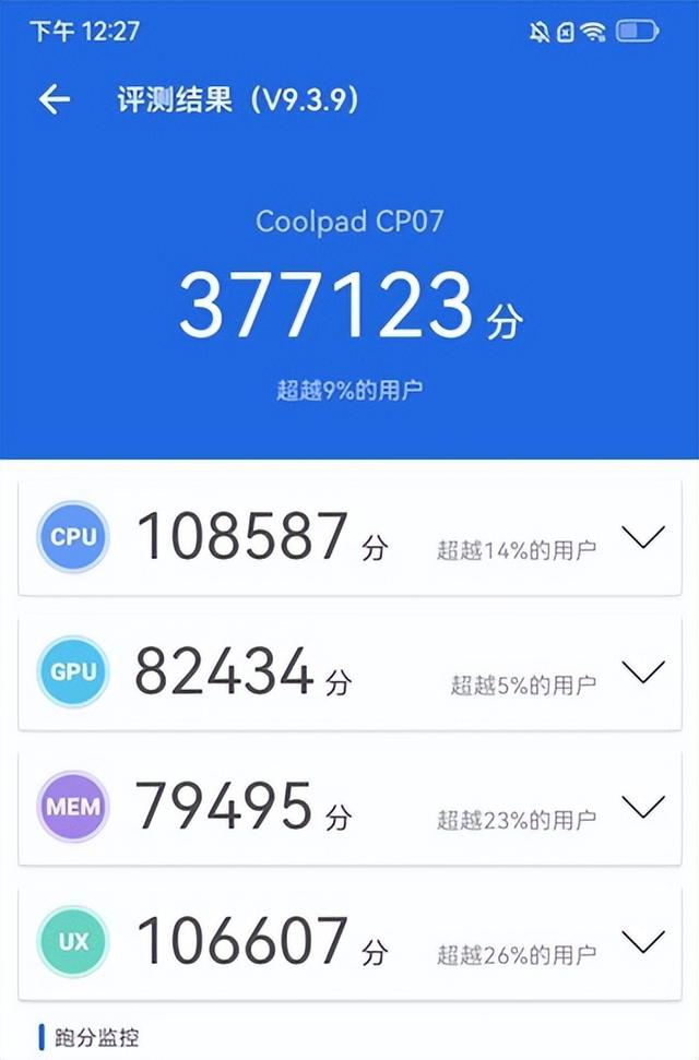 性能方面,COOL 20s搭载了天玑700八核处理器,其选用7nm制程工艺技术打造,由2个主频为2.4GHz的A76大核和6个A55小核组成。该机的安兔兔跑分测试结果如下: