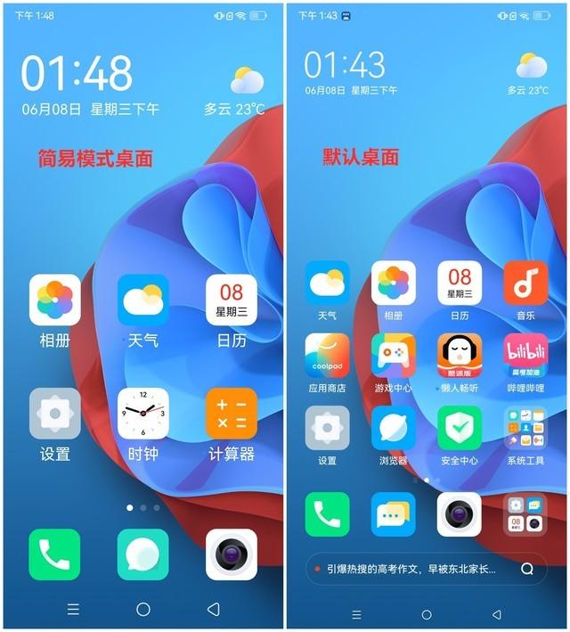 解锁智能手机,桌面图标选用经典的圆角矩形设计,较大的面积方便使用者查看、使用。这款智能手机在开启时会默认开启导航键操作,更符合用惯老式经典智能机使用者的操作直觉。当然,使用者也可以进一步开启简易模式,更大的图标操作起来也更直接。