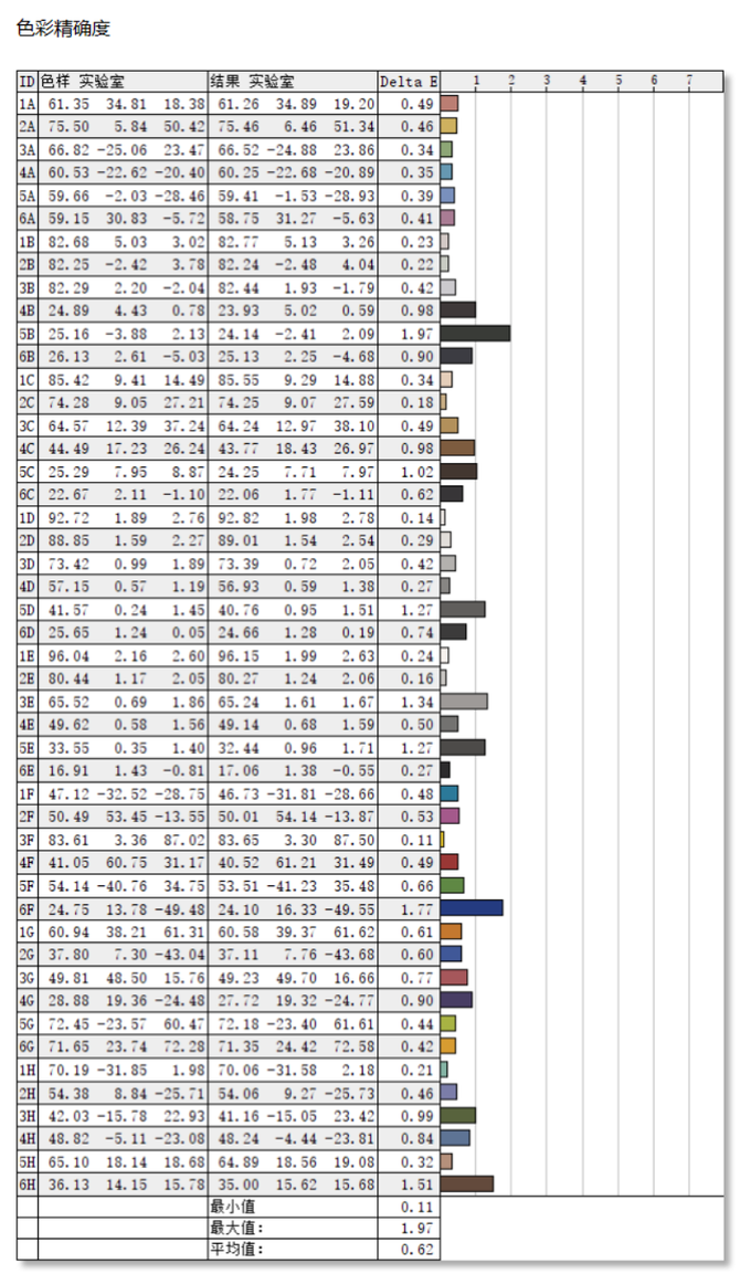 色彩准确度,表现非常亮眼,实测平均色差仅为0.62,最大值1.97,最小值仅0.11。一般我们认为平均色差小于2的屏幕就能称为高色准屏幕,人眼已经难以察觉出细微色彩差异,所以此款表明屏的色准规格是比较高的,堪比专业创作级别的表明屏。