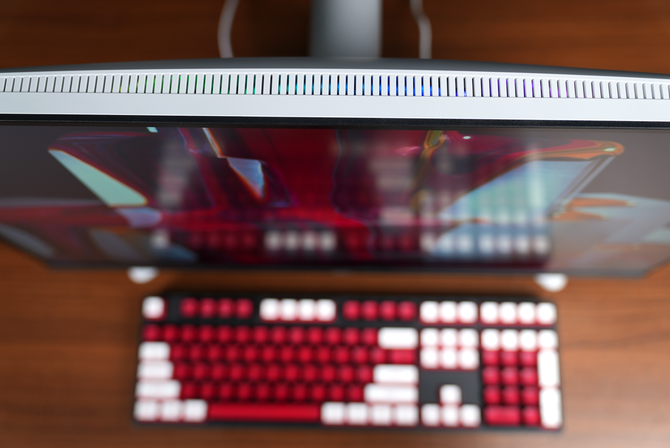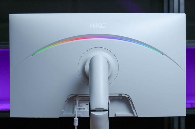 表明屏背部中央设计了一道弧形的RGB灯带,能够发出多种颜色和亮度的灯效,并支持自主调节,灯一亮,有电竞感那味了。