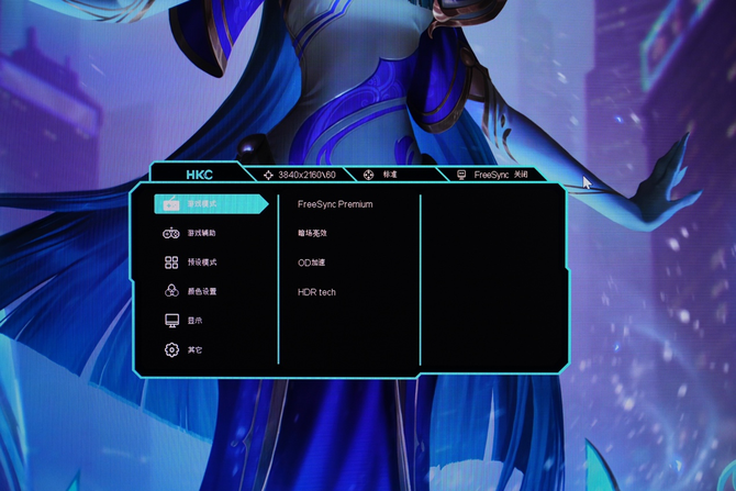 至于OSD菜单的界面,从配色上来说似乎并不符合电竞酷炫的元素,可能考虑到表明屏设置好之后基本不会每次都再重新调节,所以OSD菜单不用过于花里胡哨也合情合理。另外,菜单选项比较齐全,顶部直观表明了表明屏当前分辨率,刷新率,表明模式以及FreeSync开关状态。
