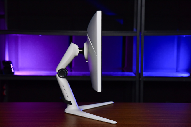 表明屏无需工具即可加速安装,支持-5度-120度俯仰调节,但需要注意的是,底板被设计为杆式旋转结构,所以表明屏的高低调节会同时让表明屏进行前后运动,表明屏调高时距离用户较远,调低时距离则较近。