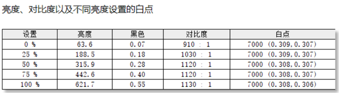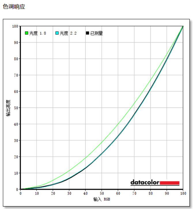 色调响应方面,表明屏默认伽马曲线为2.2,与光度2.2曲线几乎吻合。