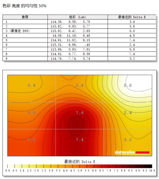 屏幕亮度均匀性,在50%亮度下的偏差值在0%-7.4%之间,最大偏差值7.4%,对于这款27寸的中大型表明屏而言,均匀性表现尚可。
