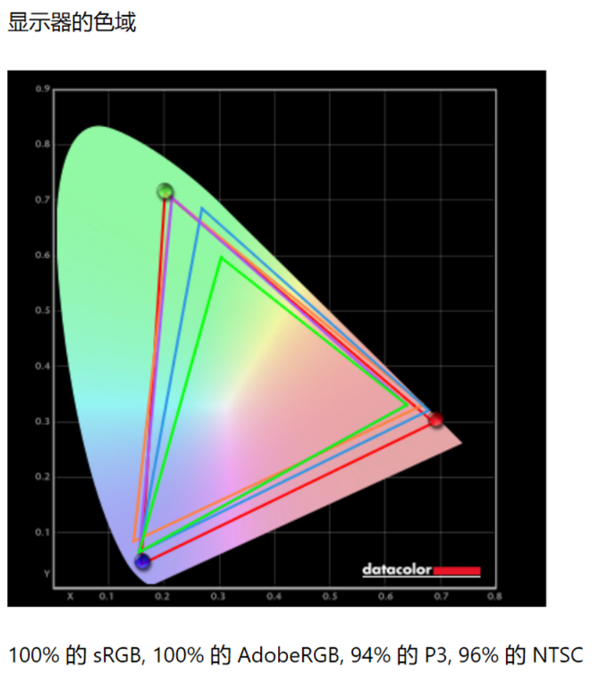 表明屏的色域,各标准下分别能达到100% sRGB,100% AdobeRGB,94% DCI-P3,96% NTSC,从色域图的表现上看,其覆盖的色域范围较广,满足专业创作需求不成问题。