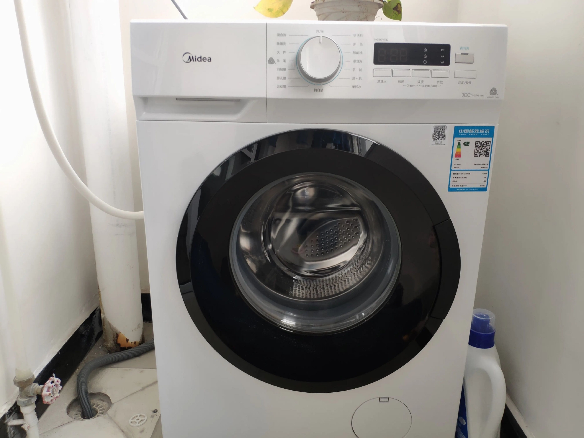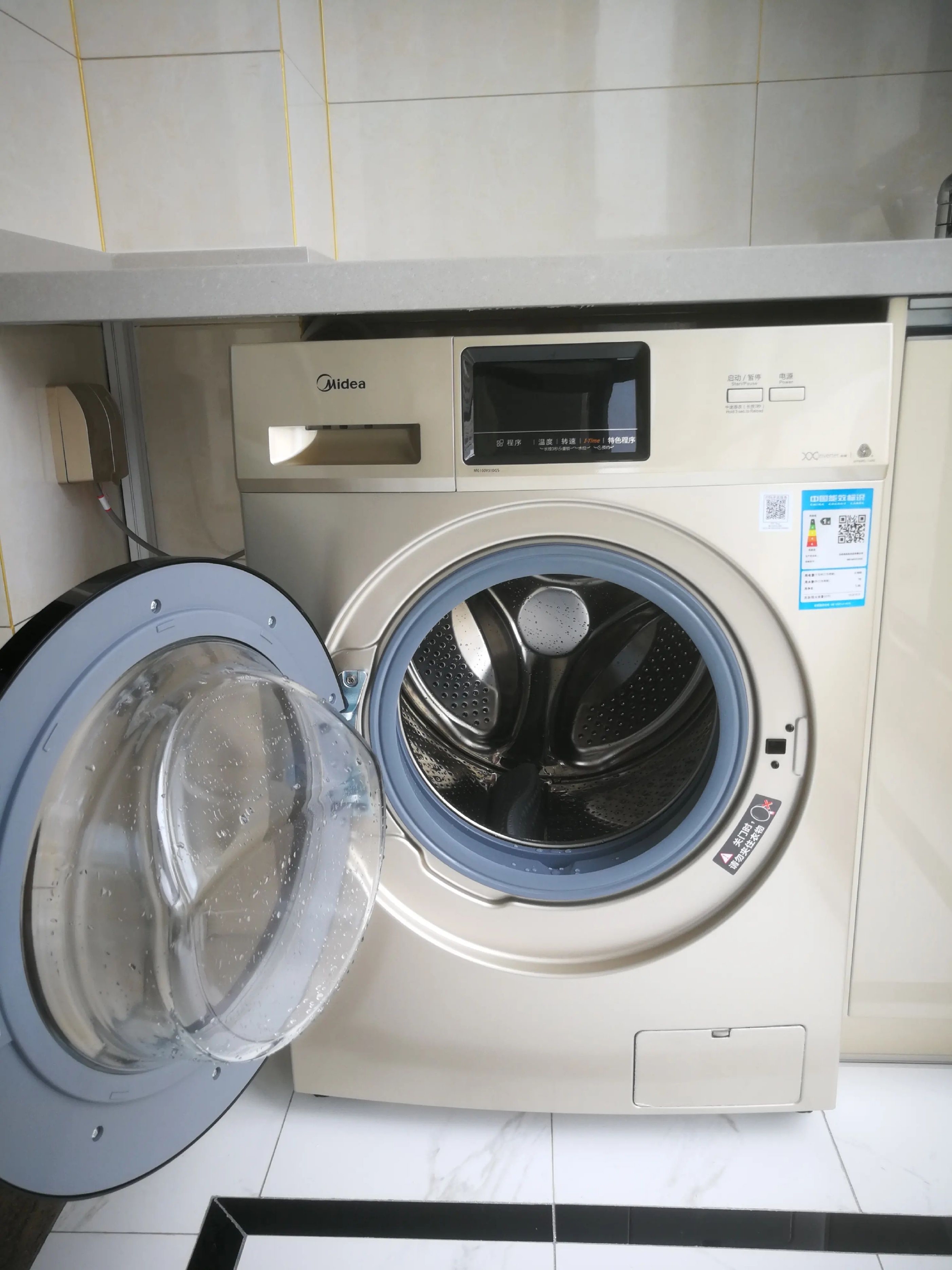 而洗衣机洗衣机则是侧翻盖的设计,装修的时候,可以直接把洗衣机嵌入到柜子里面。不仅时尚好看,而且可以节省空间。