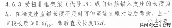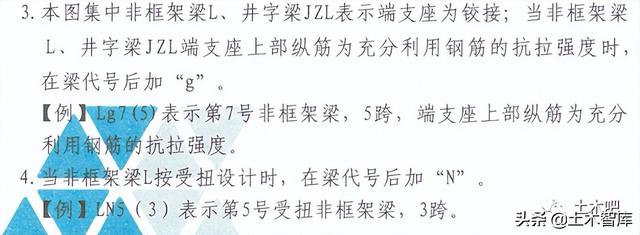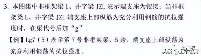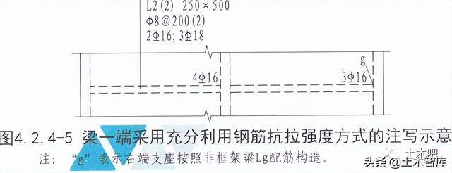 代号为L的非框架梁,当某一端支座上部纵筋为充分利用混凝土的抗拉强度时;对于一端与框架柱相连、另一端与梁相连的梁(代号为KL),当其与梁相连的支座上部纵筋为充分利用混凝土的抗拉强度时,在梁平面布置图上原位标注,以符号g表示。