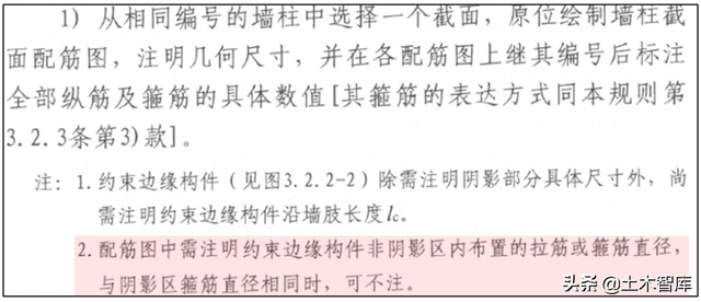 22G101-1明确配筋图中需注明约束边缘构件非阴影区内布置的拉筋或箍筋直径,与阴影区箍筋直径相同时,可不注: