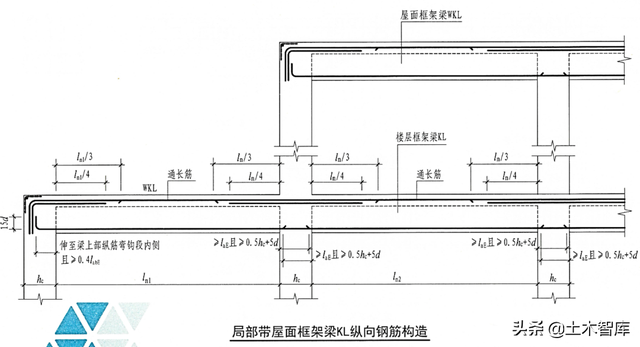 22G101-1减少了局部带屋面架构梁KL纵筋内部结构图: