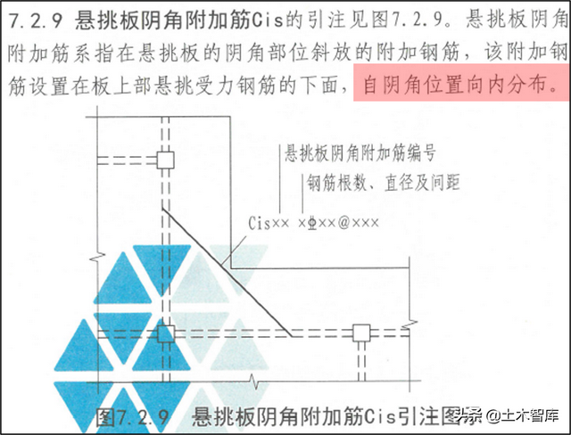22G101-1,悬挑板阴角附加筋Cis引注中,表明附加混凝土自阴角位置向内分布。16G101-1第54页无此文字表明。