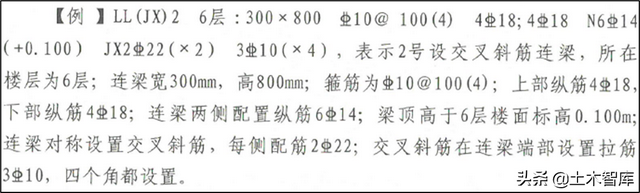 22G101-1给出连梁设置对角暗撑、交叉斜筋、对角斜筋的列表注写示例及截面注写示例。
