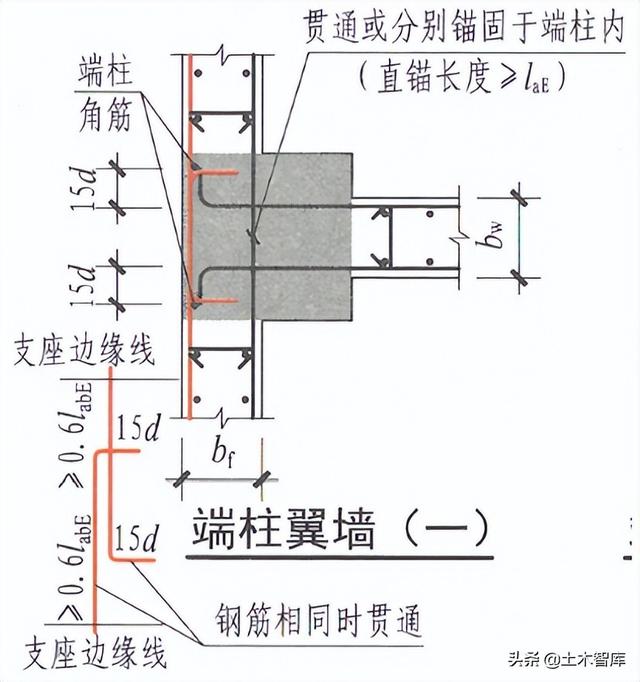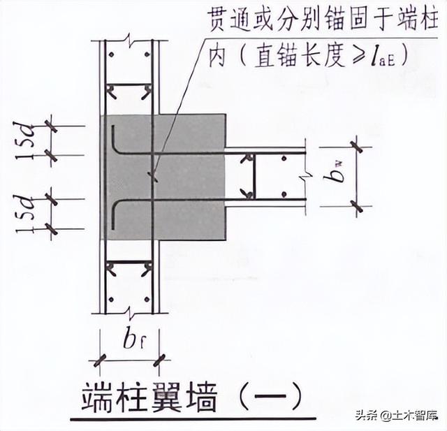 22G101-1细化了端柱翼墙(一)大样图,给出了墙混凝土不贯通的做法: