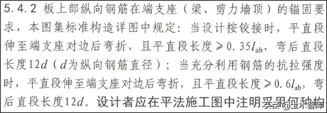 22G101-1第1-42页规定,板上部纵筋在梁端支座按铰接设计或支承在润体顶端节点充分利用混凝土抗拉强度时,弯锚弯后直皮德盖12d;16G101-1第47页规定弯锚翻转段二维宽度15d