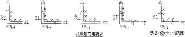 22G101-1减少柱多排纵筋及并筋时,纵筋间距要求的内部结构。其中c为最外层混凝土的保护层厚度;C1为纵筋的保护层厚度,不应小于纵筋直径d或并筋的等效直径deq。