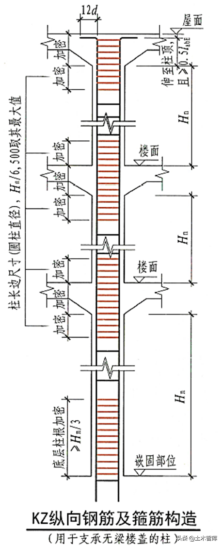 22G101-1减少了用于指出无梁楼盖的柱KZ纵向混凝土及箍筋内部结构图: