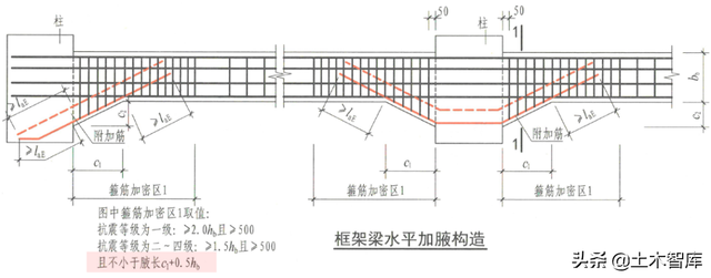 22G101-1在架构梁水平加腋内部结构中,减少了加密区不小于腋长C1+0.5hb的要求: