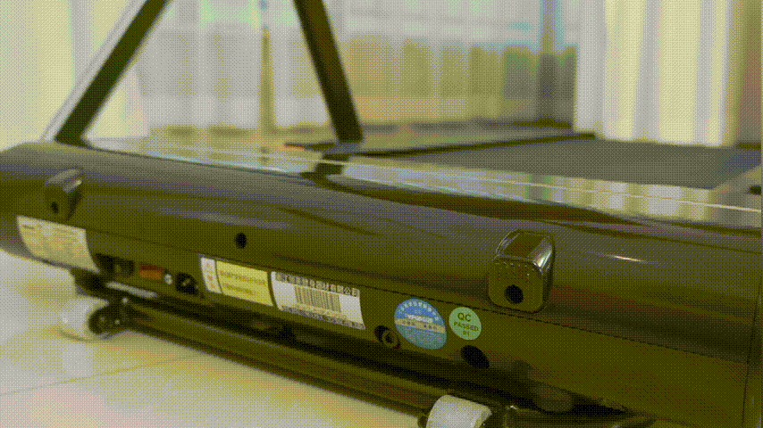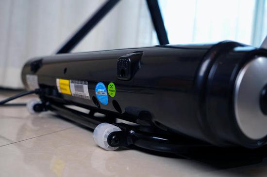 我移动的这时候还辨认出,它的底部还有移动轮结构设计,搬的这时候实在省力气很多,即使你是女生,也能随时想放在哪就放在哪。跑步机立起来的这时候移动轮还能打开支撑。