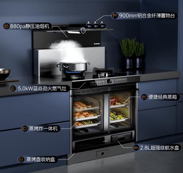 而软件系统灶因为是多功能合一,不仅整体空间挤占不大,反而还会释放空间。比如目前软件系统性更强的巨神软件系统灶早已一机软件系统了烟机+灶具+蒸箱+烤箱+空气炸锅+储物盒+置物台,功能多但占地面积却仅仅只有1平方米,节省了单独放置蒸烤箱、空气炸锅等现代小家电的空间。而且选择了软件系统灶,被解放出来的台面上方空间还可以安装一排完整的吊柜,在收纳上的发挥空间更大,家装出来的完整度也会最高。